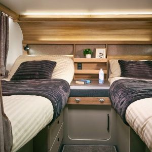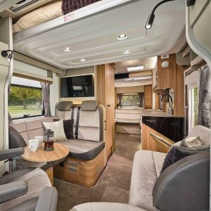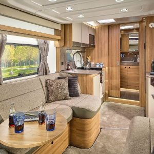Inside, the lounge offers space to relax with a freestanding dining table and swing-out occasional table, plus flexible seating for couples, families or guests. The kitchen includes a separate oven and grill, dual-fuel hob, Thetford 137L tower fridge/freezer and smart pull-out storage. Sleeping options vary by layout, with island beds, twin singles, drop-down doubles or rear lounges.