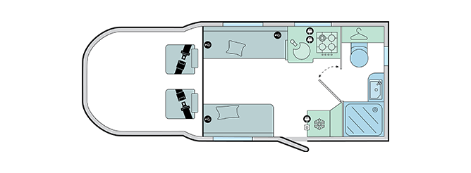 - Parallel seat front lounge with exterior access hatch underneath offside seat base