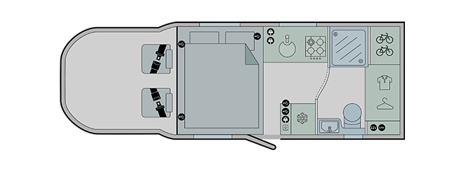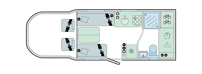 - Front Flexi-lounge featuring twin Aguti convertible travelling seats incorporating ISOFIX with dedicated travel seat cushions (model specific)