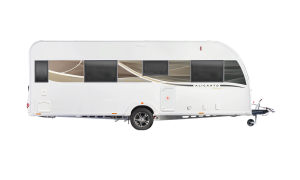 - Single axle, 8-ft wide model for up to 4 people with parallel seat front lounge and rear island king size bed