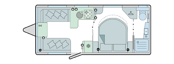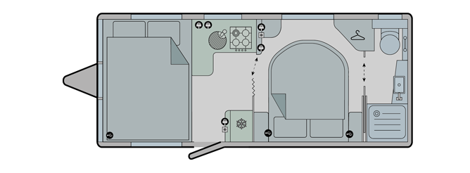- Front lounge converts to twin singles or a double bed, available in three fabric options