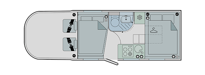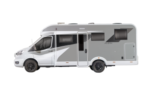 - Streamlined narrow-bodied 7-metre motorhome with a front flexi lounge and rear transverse double bed, suitable for up to 4 people
