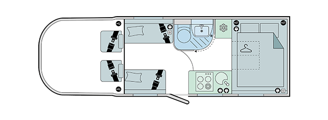 - Front Flexi-lounge featuring twin Aguti convertible travelling seats incorporating ISOFIX with dedicated travel seat cushions