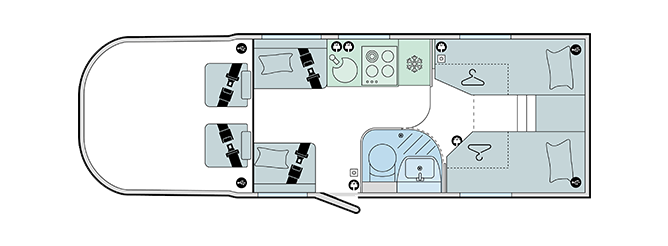 - Front Flexi-lounge featuring twin Aguti convertible travelling seats incorporating ISOFIX with dedicated travel seat cushions