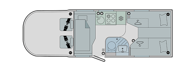 - Streamlined narrow-bodied 7-metre motorhome with a front flexi lounge and rear twin single beds, suitable for up to 3 people
