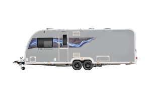 - Twin axle, 8-ft wide model for up to 4 people with C-shaped front lounge and rear island king size bed