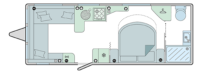 - Large C-shaped front lounge with wall-mounted TV station (TV available as a cost upgrade), converts to a double bed, available in three fabric options