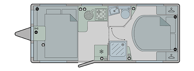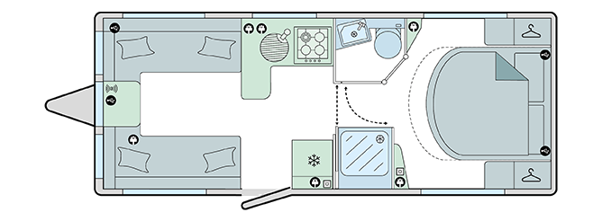 - Front lounge converts to twin singles or a double bed, available in three fabric options
