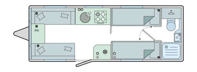 - Front lounge converts to twin singles or a double bed, available in two fabric options