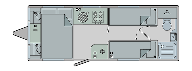 - Single axle, 7’5” wide model for up to 4 people with parallel seat front lounge and rear twin single beds
