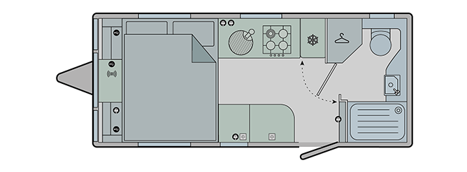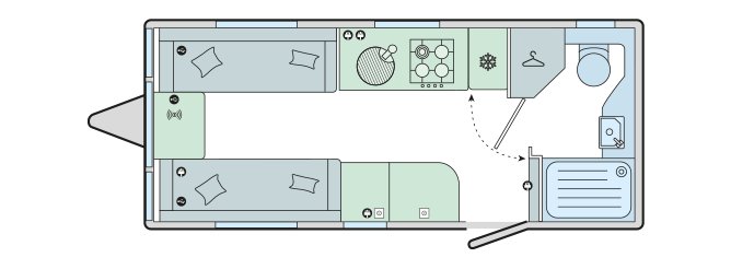 - Front lounge converts to twin singles or a double bed, available in two fabric options